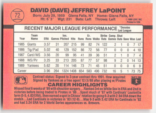 1990 Donruss #72 Dave LaPoint New York Yankees 1626