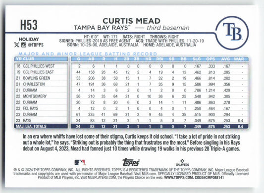 2024 Topps Holiday #H53 Curtis Mead Tampa Bay Rays Rookie 1597