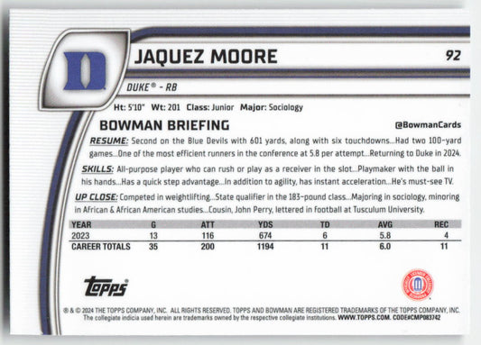 2024 Bowman University Chrome #92 Jaquez Moore Duke Blue Devils FB1-611