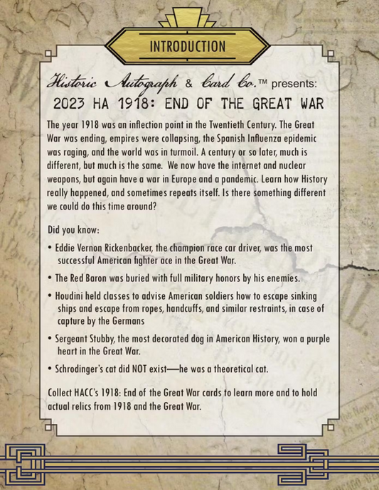 2023 Historic Autographs 1918: End of the Great War Hobby Pack (10 Cards)