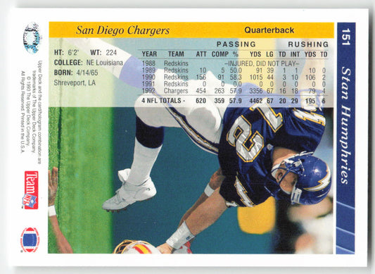 1993 Upper Deck #151 Stan Humphries San Diego Chargers FB1-229