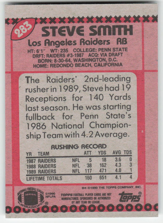 1990 Topps #283 Steve Smith Los Angeles Raiders Rookie FB1-558
