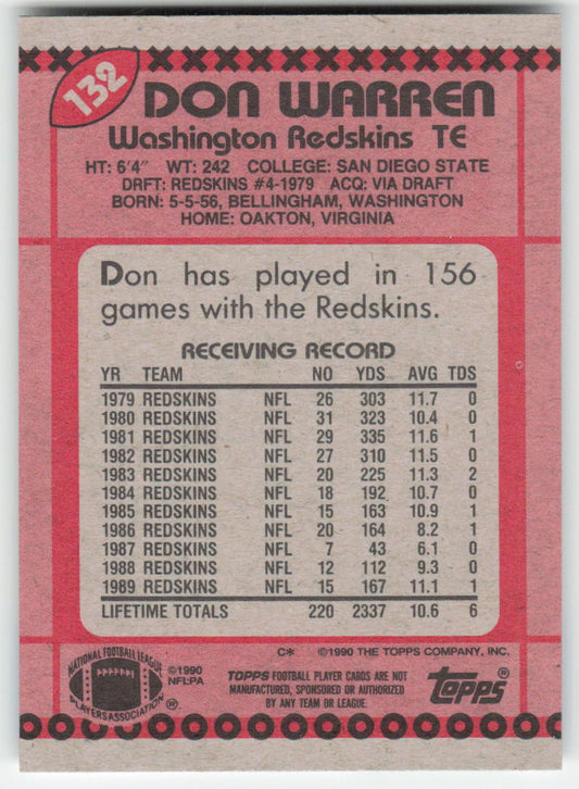 1990 Topps #132b Don Warren Washington Redskins FB1-564
