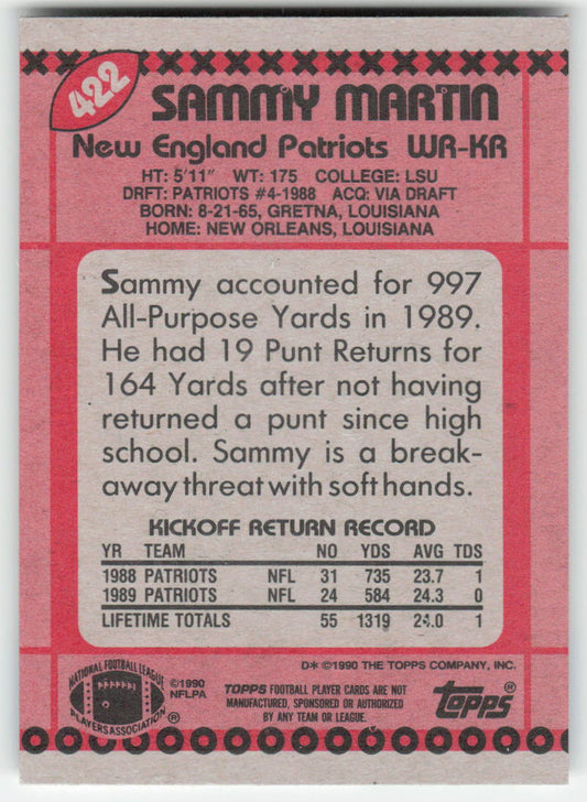 1990 Topps #422b Sammy Martin New England Patriots Rookie FB1-566