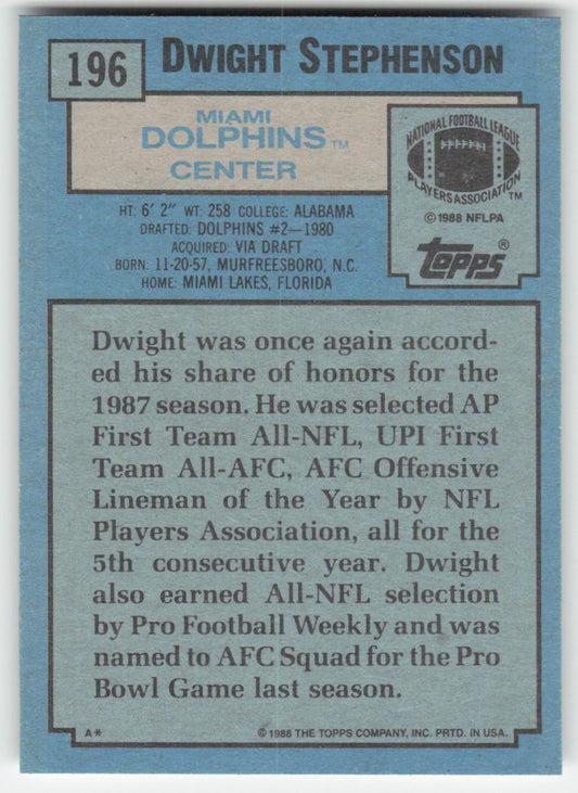 1988 Topps #196 Dwight Stephenson Miami Dolphins FB1-88