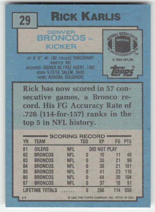 1988 Topps #29 Rich Karlis Denver Broncos FB1-89