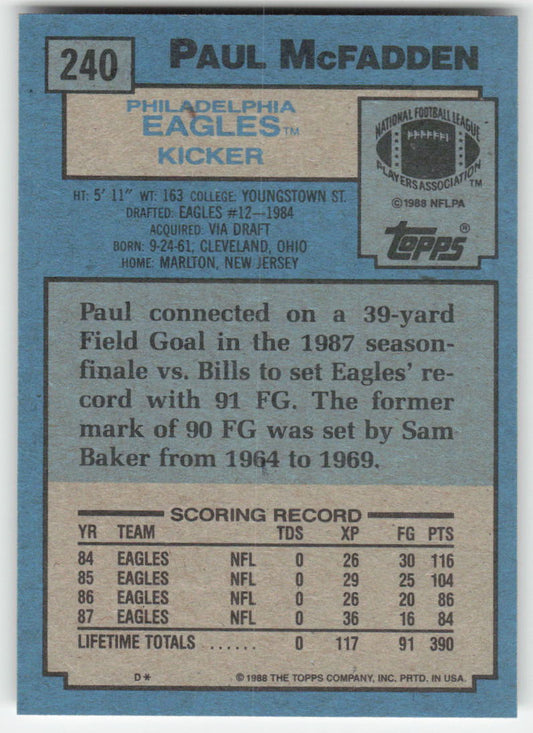 1988 Topps #240 Paul McFadden Philadelphia Eagles FB1-95