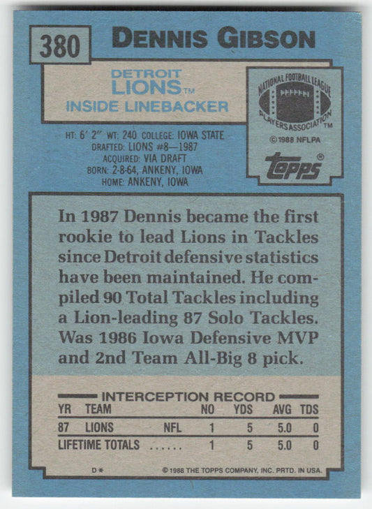 1988 Topps #380 Dennis Gibson Detroit Lions Rookie FB1-240