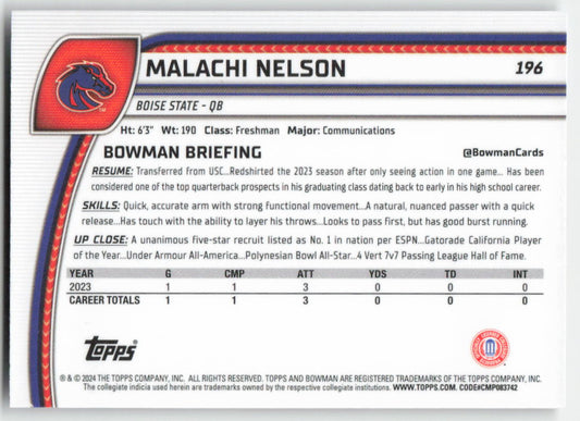 2024 Bowman University Chrome #196 Malachi Nelson Boise State Broncos FB1-480