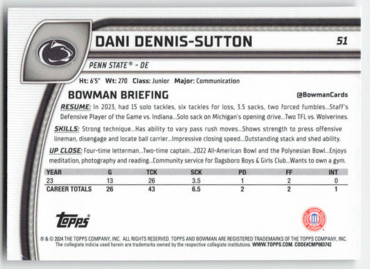 2024 Bowman University Chrome #51 Dani Dennis-Sutton Penn State FB1-481