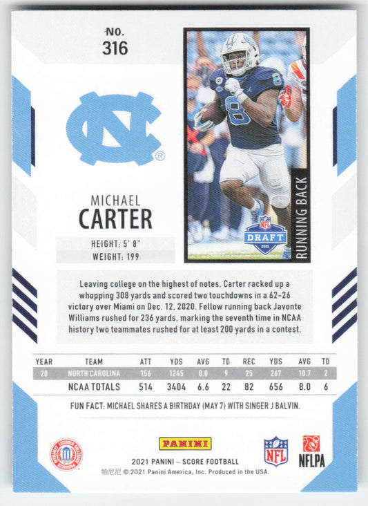 2021 Score #316 Michael Carter North Carolina Tar Heels Rookie FB1-491