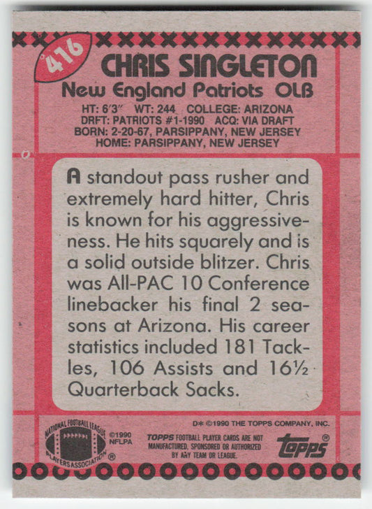 1990 Topps #416 Chris Singleton New England Patriots Rookie FB1-59
