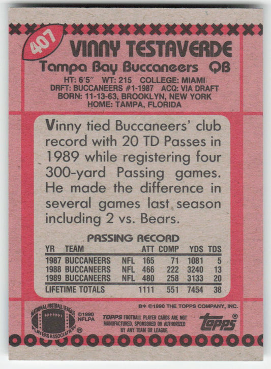 1990 Topps #407 Vinny Testaverde Tampa Bay Buccaneers FB1-57