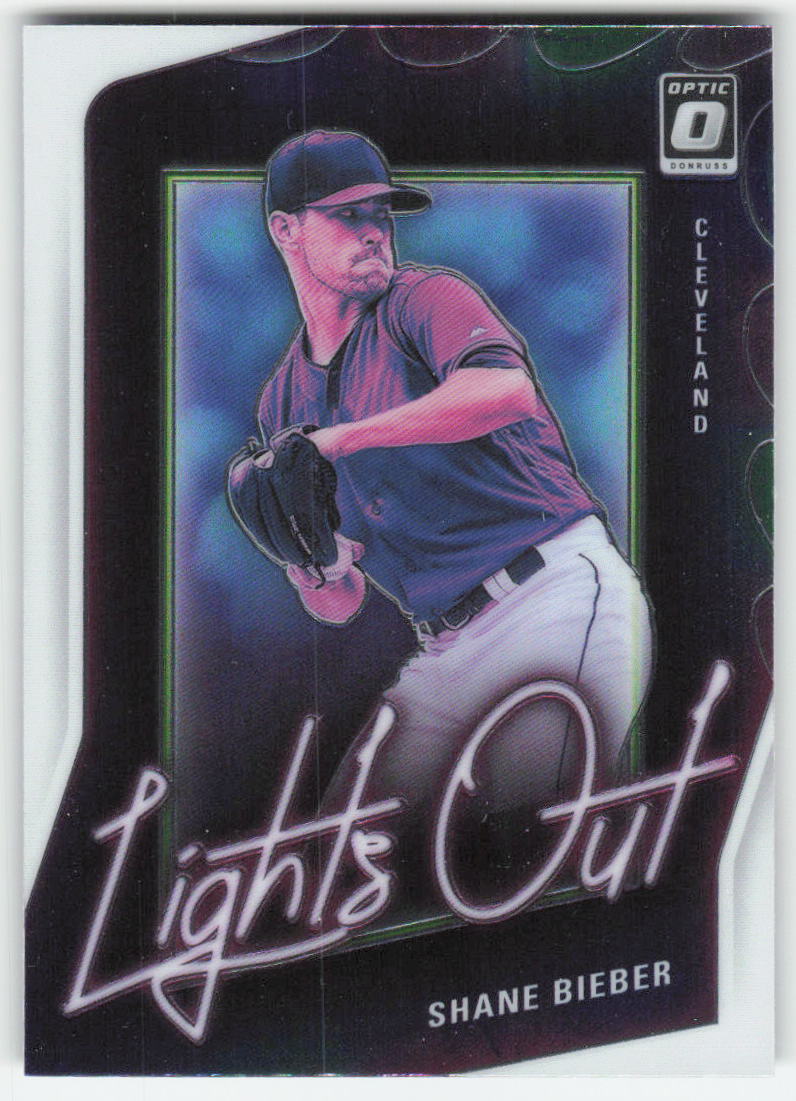 This is a nice example of a 2021 Donruss Optic #LO15 Shane Bieber Lights Out