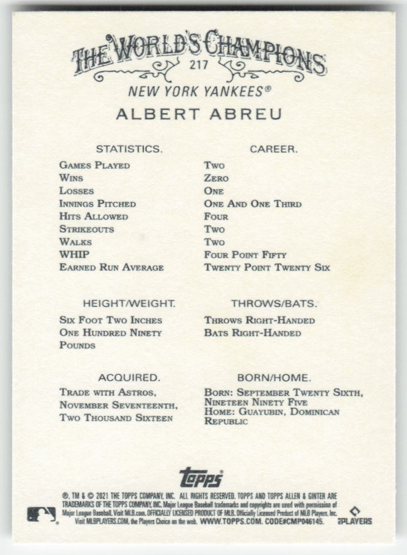 This is a nice example of a 2021 Topps Allen & Ginter #217 Albert Abreu