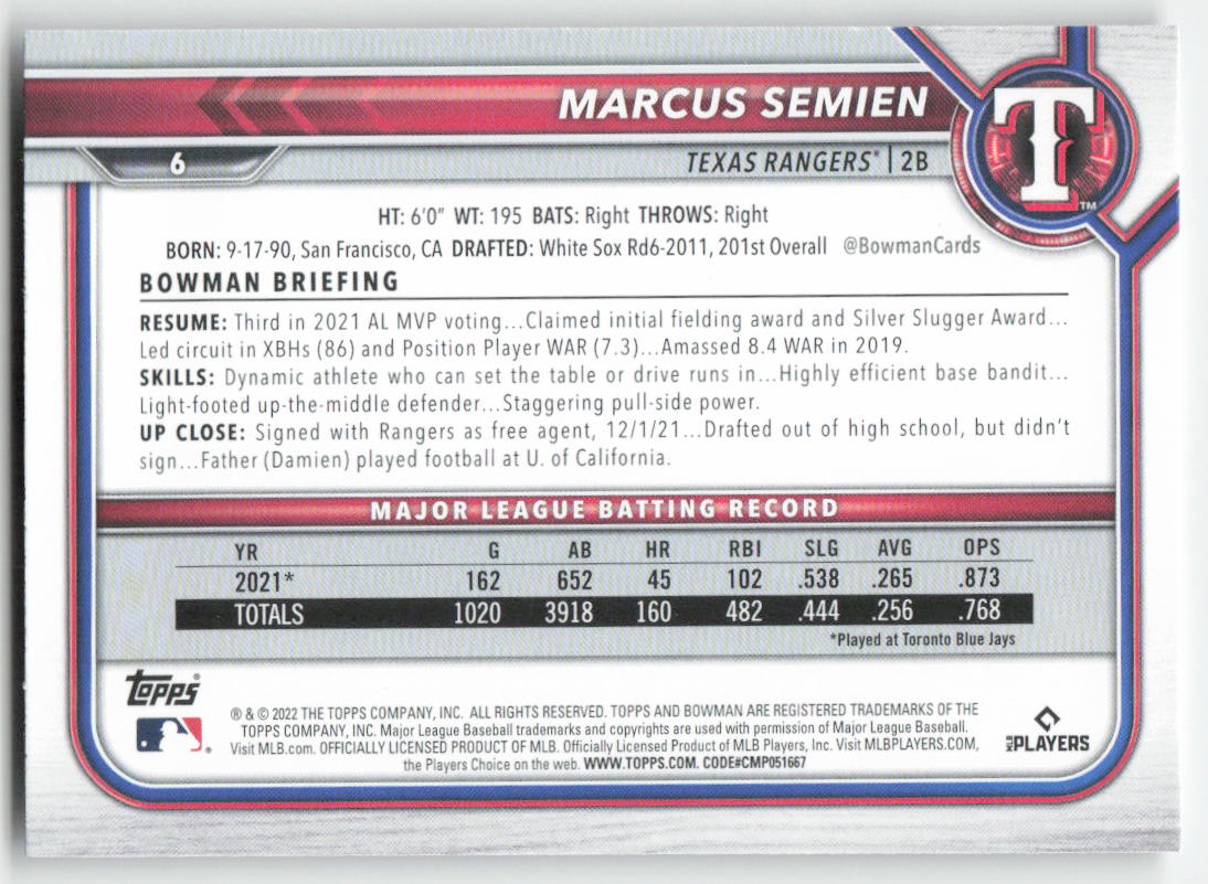 2022 Bowman #6 Marcus Semien Texas Rangers 593