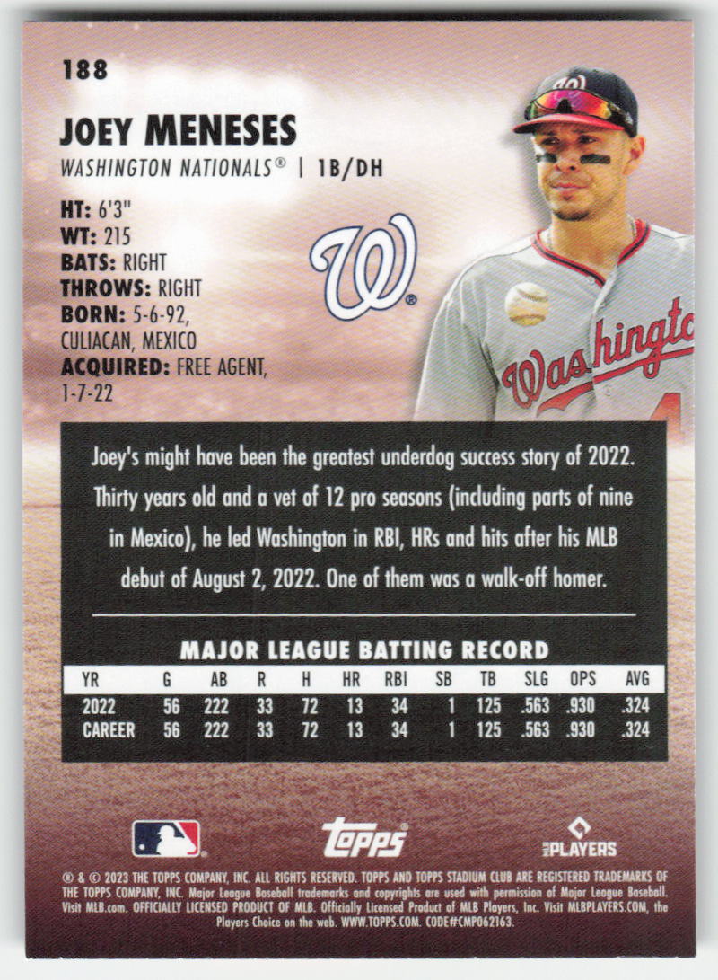 This is a nice example of a 2023 Stadium Club #188 Joey Meneses