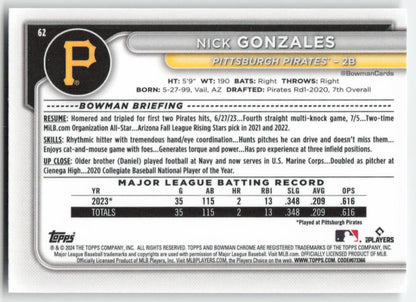 2024 Bowman #62 Nick Gonzales Chrome Mojo Refractors Pittsburgh Pirates 886