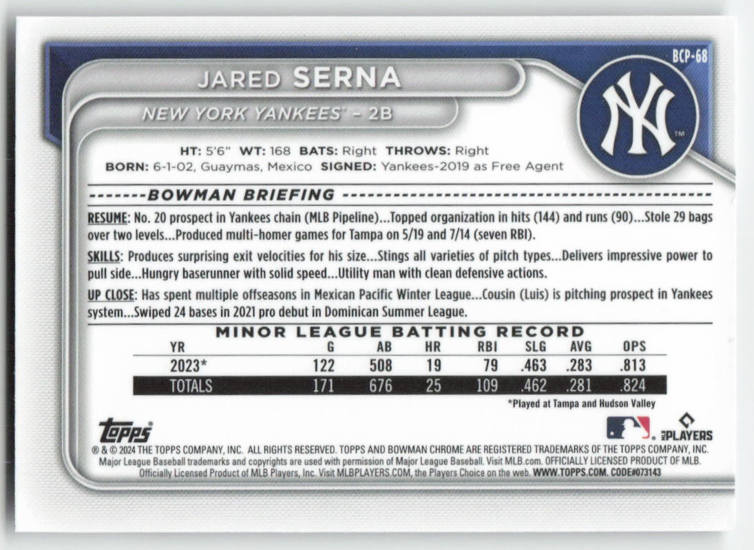 2024 Bowman #BCP-68 Jared Serna Chrome Prospects New York Yankees 899
