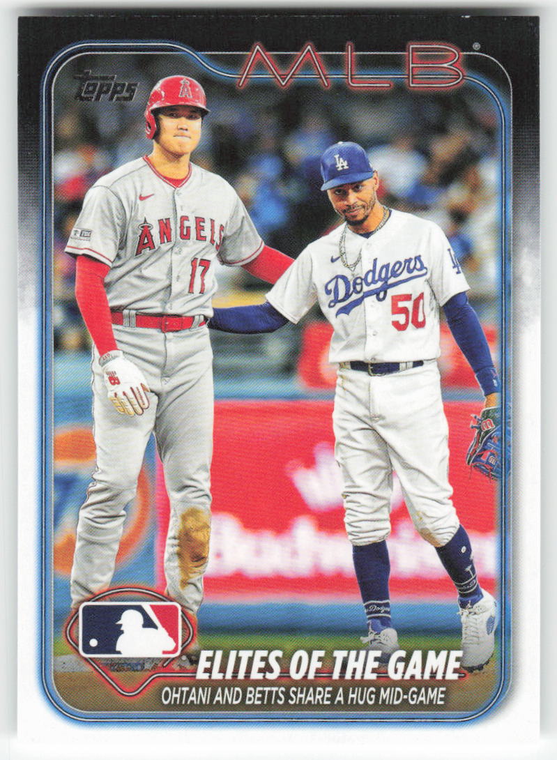 This is a nice example of a 2024 Topps #138 Elites of the Game: Ohtani and Betts Share a Hug Mid-Game