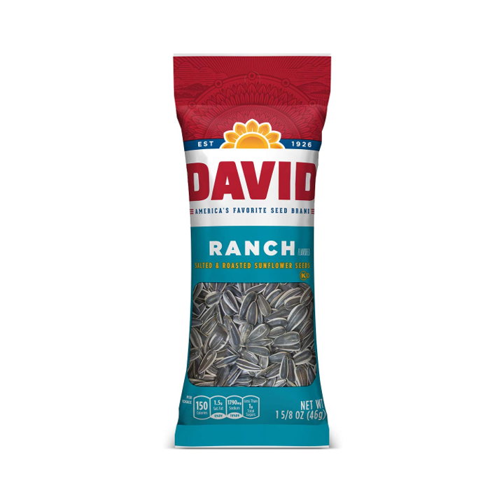 Splitting, spitting, and snacking! Reliable since 1926, David's(R) sunflower seeds are packed with bold and irresistible flavors to let your tastebuds run wild. These ranch flavored sunflower seeds are salted and roasted to perfection inside a resealable bag that makes transport easy. What's more, these seeds give you even more bang for your buck. Perfect for midday snacking, sporting events, concerts, ball games, movie nights, traveling, camping, and more. Never leave home without a delicious and fun snack; stay stocked up on David(R) Ranch Sunflower Seeds!